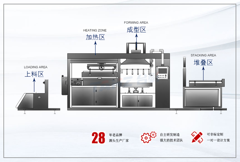 >> 为配合不同材质成型,真空排量采用双体同阀互补设计,保证了拉伸度及高难度产品快速成型;